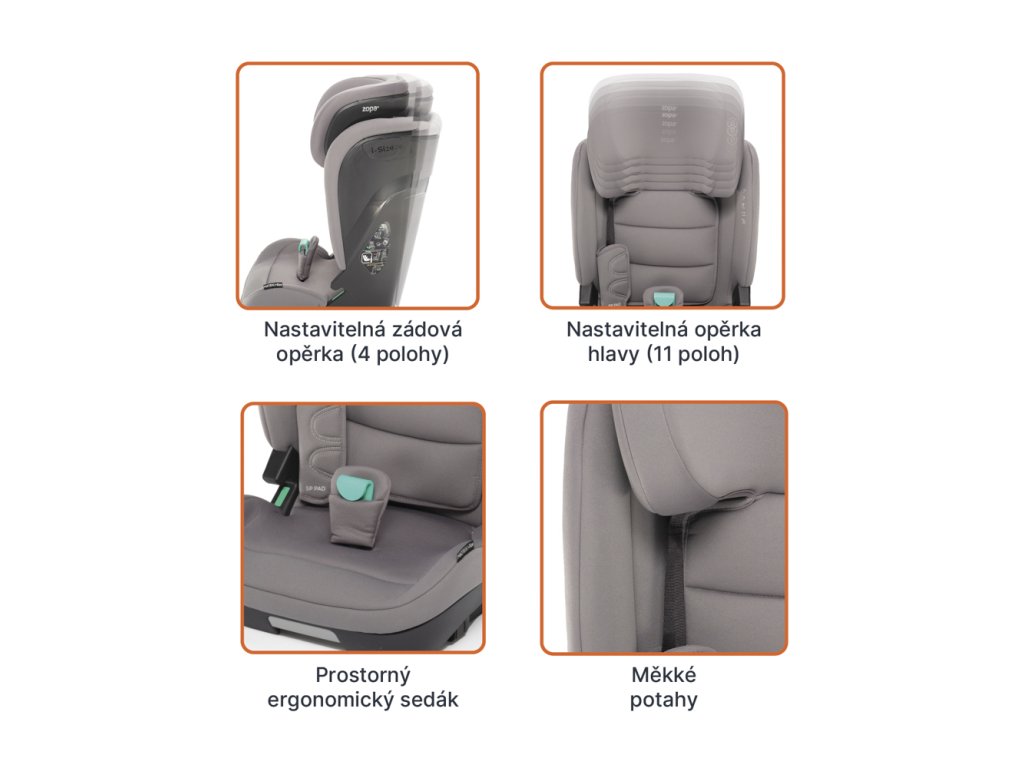 poistkou v prednej časti autosedačky. Opierka hlavy ponúka až 10 polôh