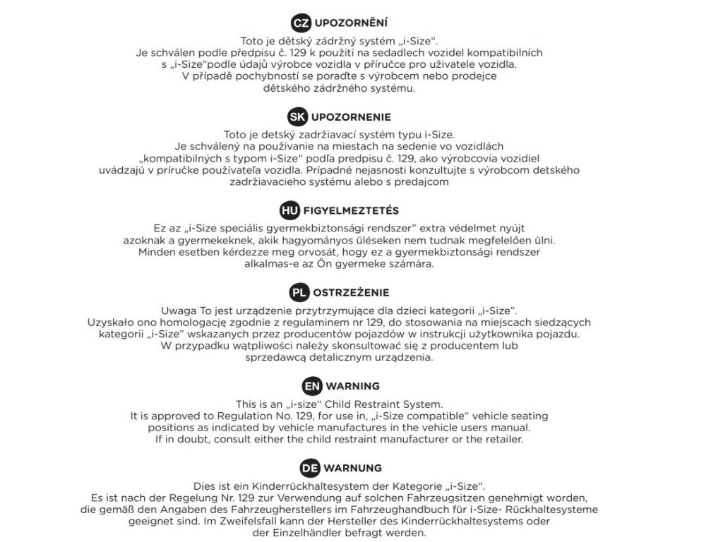 Toto je detský zadržiavací systém typu i-Size. Je schválený na používanie na miestach na sedenie vo vozidlách „kompatibilných s typom i-Size“ podľa predpisu č. 129, ako výrobcovia vozidiel uvádzajú v príručke používateľa vozidla. Prípadné nejasnosti konzultujte s výrobcom detského zadržiavacieho systému alebo s predajcom