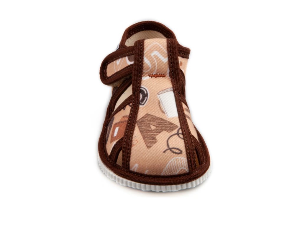 Detské papuče, sandálkového strihu s uzavretou špicou so zapínaním na "suchý zips ". Tvar špičky s dôrazom na typicky detský dominantný palček zabezpečuje dostatočný priestor pre prsty. Papučky sú ľahké, pružné, vyrobené z textilu ( zo 100% bavlny ), ktorý zabezpečuje priedušnosť a dokonalú prispôsobilosť tvaru nohy. Stielka papučky je v časti klenku vyplnená penovým materiálom, čo zabezpečuje dieťaťu pohodlnú chôdzu a podporuje zdravý vývoj nohy. Obuv je určená do interiéru ako prezúvková obuv. Je zdravotne a hygienicky nezávadná. Obuv sa ako nová môže na hladkých povrchoch šmýkať ( keramická dlažba, laminátová podlaha...) Na takéto povrchy je vhodnejšia obuv z našej ponuky pod označením inovatívne a flexi papuče. V rámci licenčného oprávnenia na používanie ochrannej známky Žirafa a Česká kvalita bola posudzovaná komisiou odborníkov a detského ortopéda.