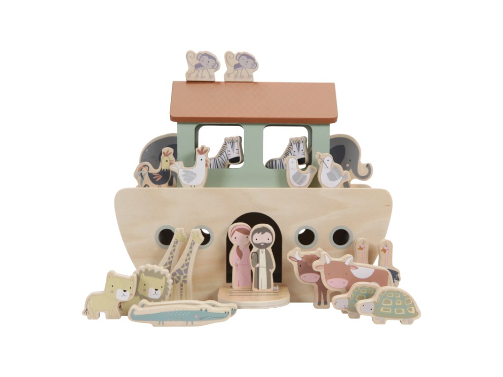 Všetci na palubu! Zahrajte si príbeh Noemovej archy s touto krásnou sadou. Pomôžte zvieratám nájsť sa a pripravte ich na cestu. Každý cestujúci má rovnocenného priateľa, s ktorým cestuje. Táto 25-dielna sada obsahuje archu s dverami, palubu, ktorú možno zdvihnúť a priviesť všetky zvieratá na palubu. Noah vezme svoju ženu a veľkú skupinu zvierat na cestu cez oceán: 2 levy, 2 slony, 2 zebry, 2 opice, 2 holuby, 2 krokodíly, 2 korytnačky, 2 žirafy, 2 pštrosy, 2 kravy, kurča a kohúta. Táto sada Noemovej archy podporuje hranie rolí, zvyšuje predstavivosť a slovnú zásobu, zatiaľ čo sa vaše dieťa učí tento klasický príbeh. Vhodné pre deti od 18 mesiacov. Rozmery: 14,6 x 29,7 x 24,7 cmDodatočné parametre
