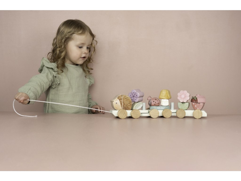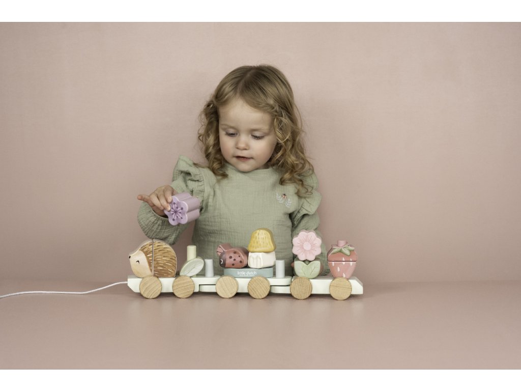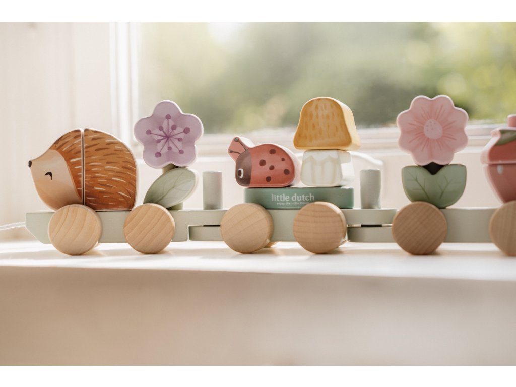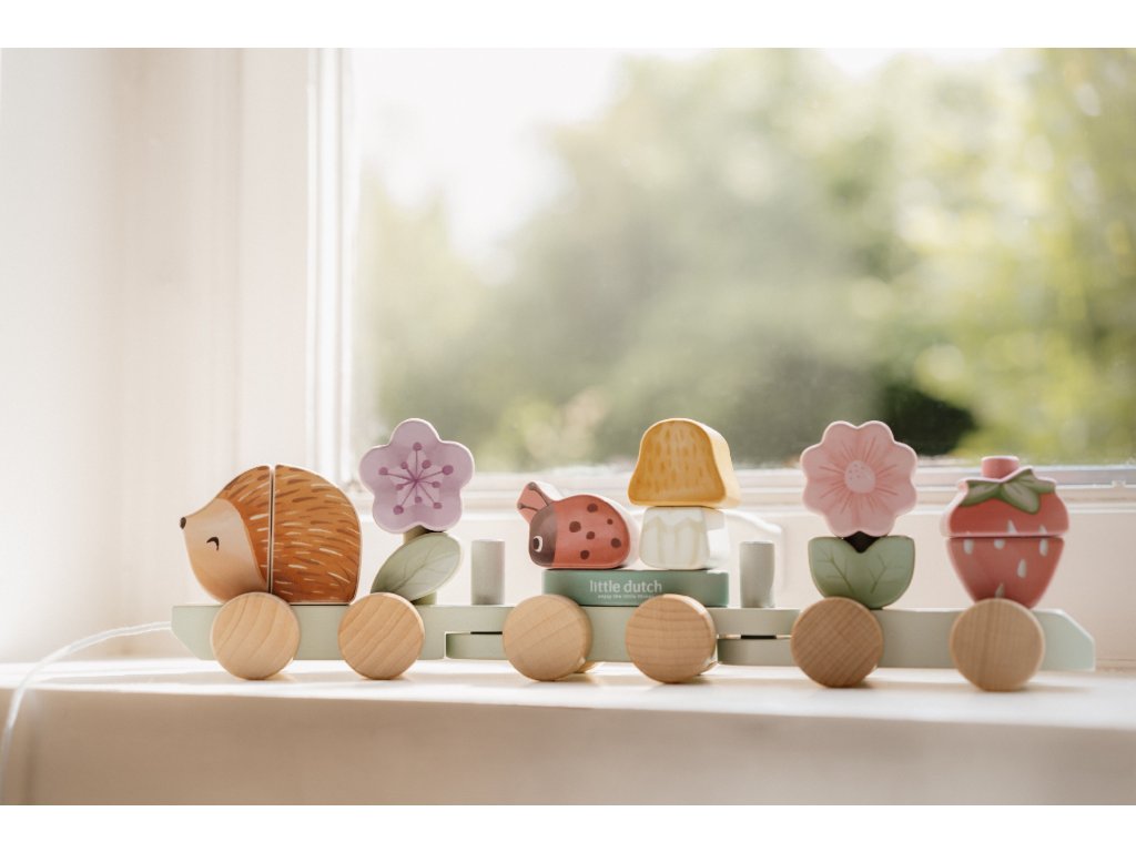Originálny drevený vláčik z dielne Little Dutch je tvorený kockami rôznych farieb v tvare ježka, lienky, huby, kvetov a jahody. Kombinovaním kociek si vaše dieťa môže zostavovať rôzne varianty vagónov podľa svojej fantázie. Vláčik zaistí vášmu dieťaťu veľa zábavy a môže slúžiť aj ako krásna dekorácia v detskej izbe. Hračka je súčasťou dizajnovej kolekcie hračiek a doplnkov Little Dutch Fairy Garden inšpirovanej životom na záhrade. Vyrobené z dreva certifikovaného FSC. Rozmery: 38,2 x 7 x 10,6 cm Vhodné pre deti od 18 mesiacov.Dodatočné parametre