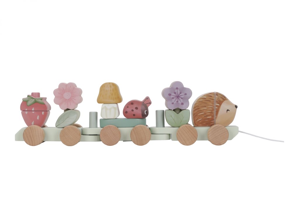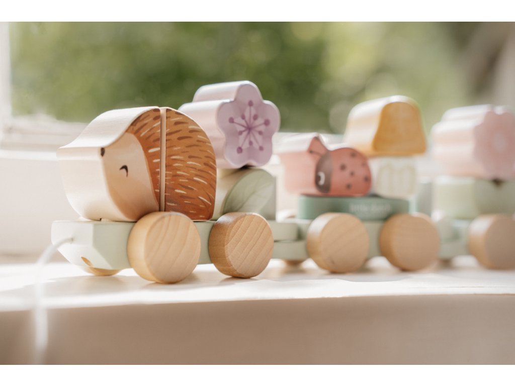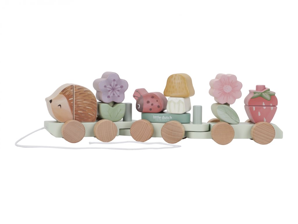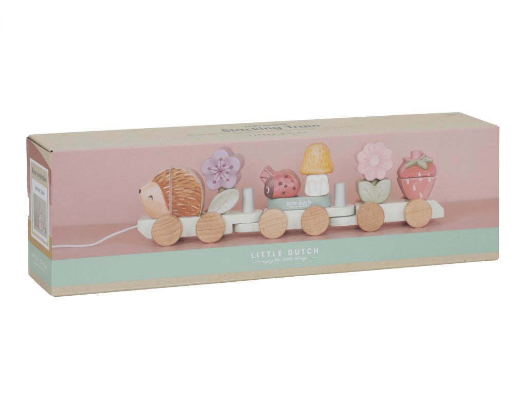 Originálny drevený vláčik z dielne Little Dutch je tvorený kockami rôznych farieb v tvare ježka, lienky, huby, kvetov a jahody. Kombinovaním kociek si vaše dieťa môže zostavovať rôzne varianty vagónov podľa svojej fantázie. Vláčik zaistí vášmu dieťaťu veľa zábavy a môže slúžiť aj ako krásna dekorácia v detskej izbe. Hračka je súčasťou dizajnovej kolekcie hračiek a doplnkov Little Dutch Fairy Garden inšpirovanej životom na záhrade. Vyrobené z dreva certifikovaného FSC. Rozmery: 38,2 x 7 x 10,6 cm Vhodné pre deti od 18 mesiacov.Dodatočné parametre