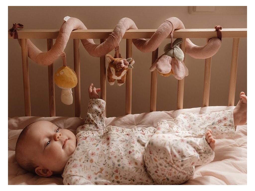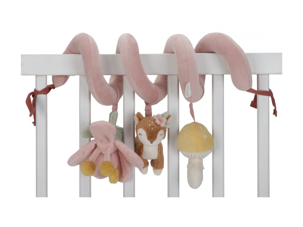 Textilná špirála so zavesenými hračkami v podobe srnky, kvety a hubky zabaví vaše bábätko v postieľke, kočíku aj v autosedačke. Mäkké hračky vyrobené z jemného plyšu hrkajú, šuštia a ponúkajú rôzne textúry na skúmanie. Hračky stimulujú koordináciu ruka/oko dieťaťa. Špirálu ľahko pripevníte omotaním okolo bočnice postieľky či madla autosedačky aj kočíka. Špirála s hračkami je súčasťou dizajnovej kolekcie hračiek Little Dutch Fairy Garden inšpirovanej životom na záhrade. Rozmery: 22 x 13 x 12 cm Vhodné pre deti od narodenia.Dodatočné parametre