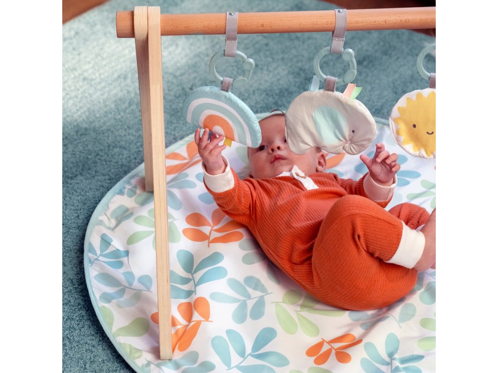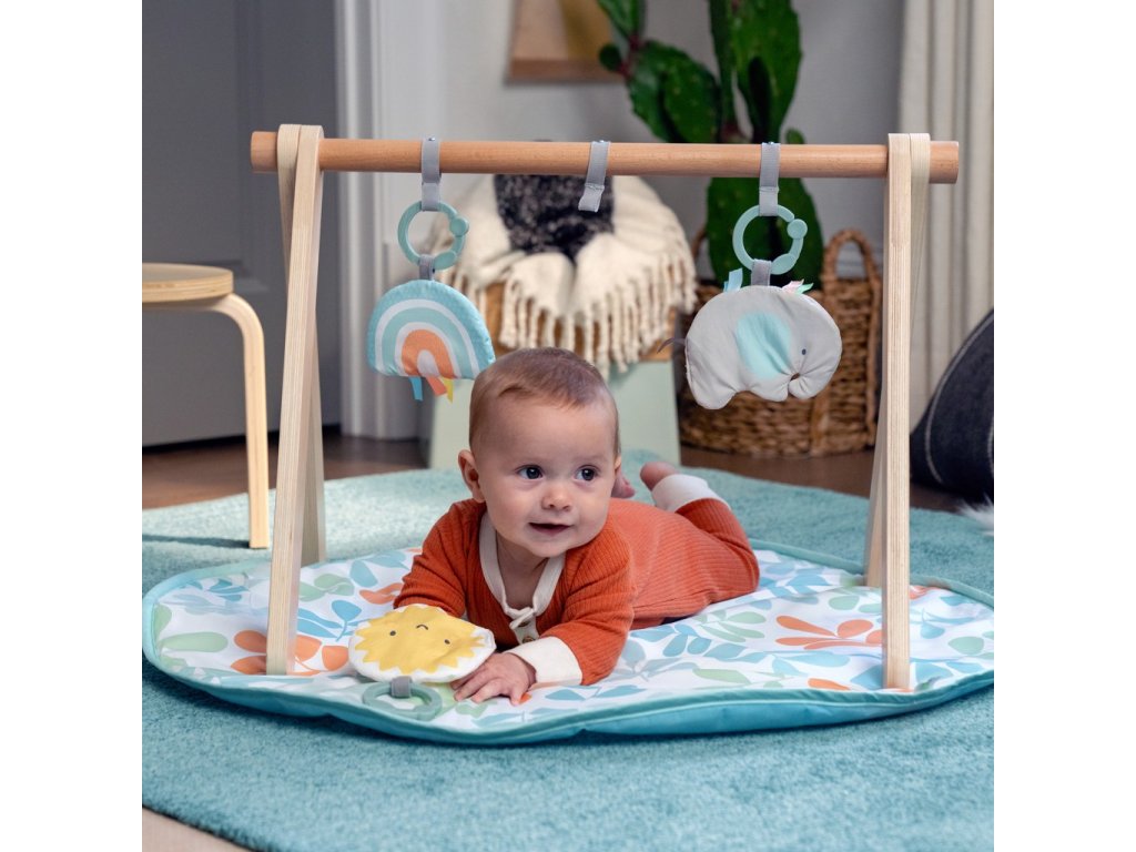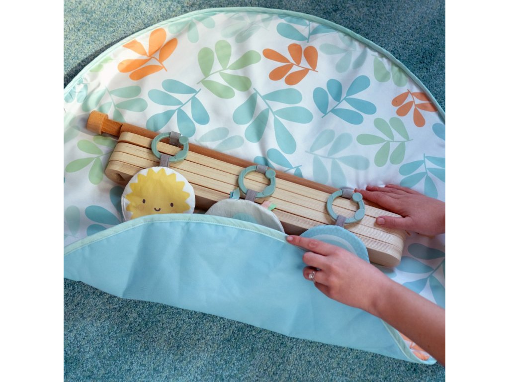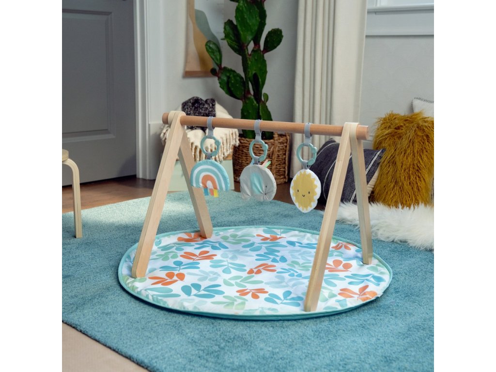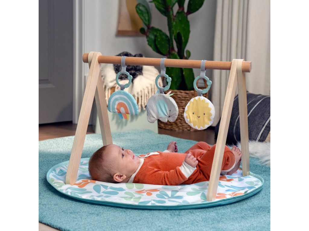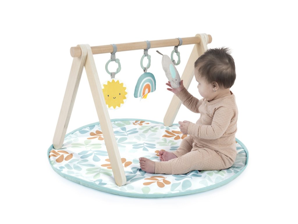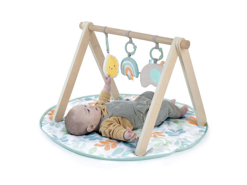 - Deka na hranie s drevenou hrazdičkou Arch & Play Mat od Ingenuity Sun. Skladacia drevená hrazdička s A-rámom sa dá ľahko zložiť alebo zobrať na cesty.