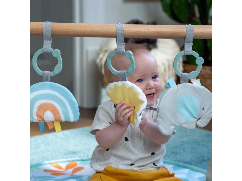 - Hrazdička sa dodáva s 3 hračkami na C-krúžku: plyšová dúha so zvonkohrou, sloník Van s farebnými štítkami a slnko - zrkadlo z mäkkej látky pre sebaobjavovanie.