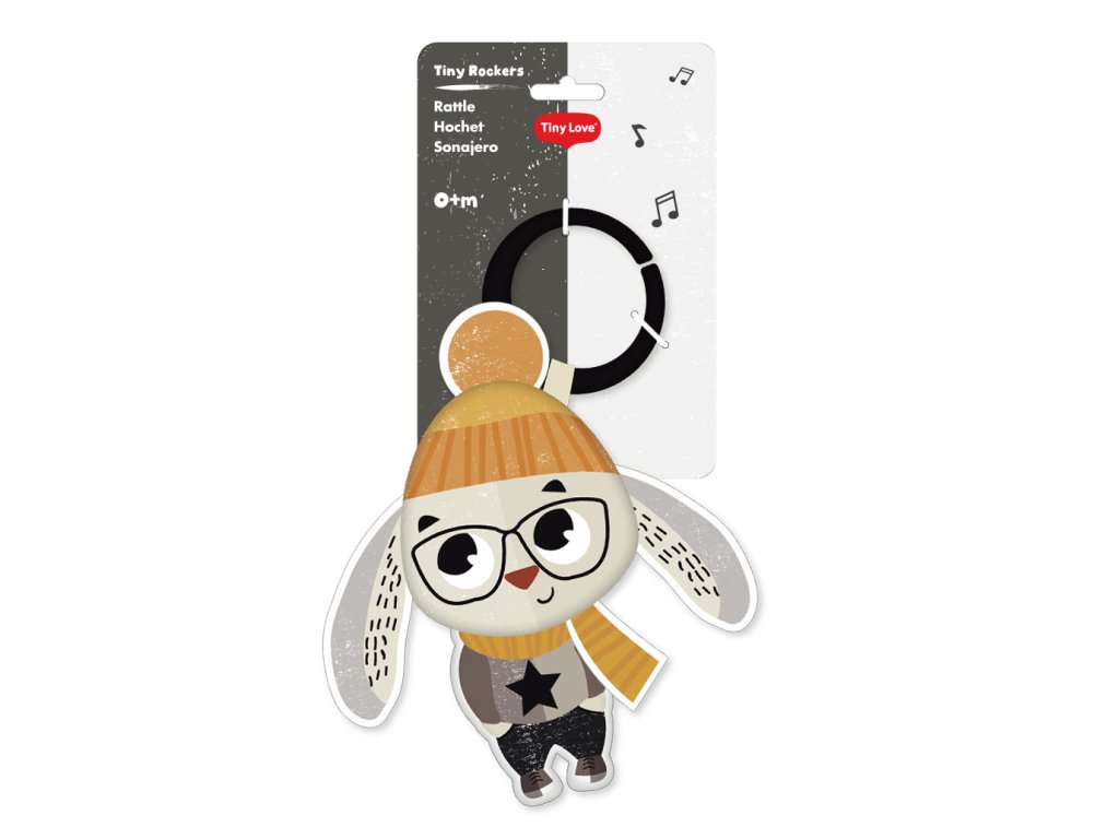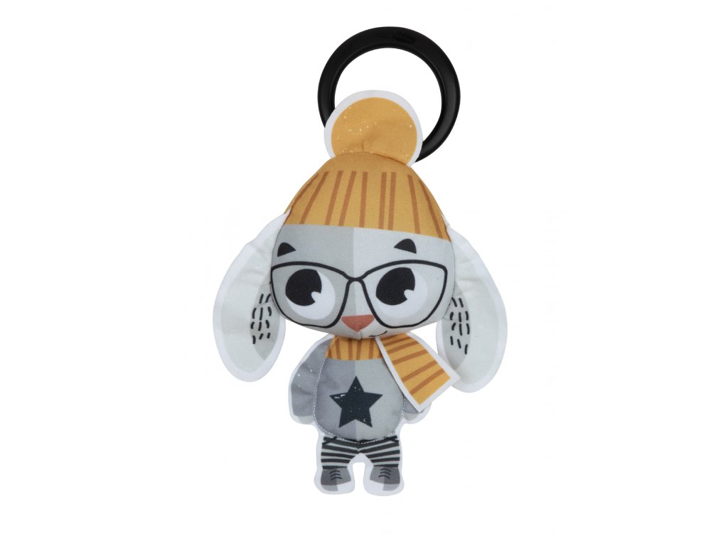 Originálna hrkálka v podobe zajačika je vyrobená z mäkkého textilného materiálu. Hračka pri pohybe hrká, uši zajačika pri stlačení šuštia. Vďaka plastovému krúžku je možné ju zavesiť na autosedačku či kočík, aby mohla vaše dieťa zabaviť aj na cestách. Rozmery: 27 x 13,5 x 5,5 cm Vhodné pre deti od narodenia.Dodatočné parametre