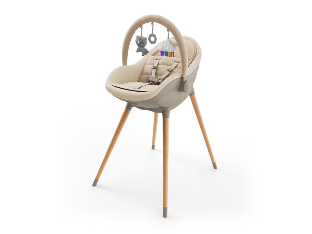 Súčasťou balenia je tiež mäkká novorodenecká vložka a hrazdička s tromi hračkami - drobnosť, ktorá zabaví ručičky a rodičom dopraje krátku, pokojnejšiu chvíľku. Celkový vzhľad dotvára bukové nohy, tlmené farby a mäkké materiály – FINI UP pôsobí ako premyslený kus nábytku, ktorý je súčasťou interiéru, nie ako „dočasná“ výbava. Po BLW nie je upratovanie boj - sedák aj pultík stačí rýchlo utrieť.