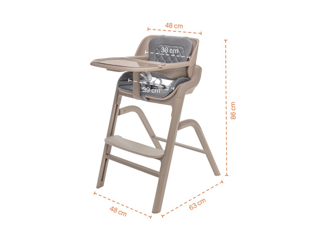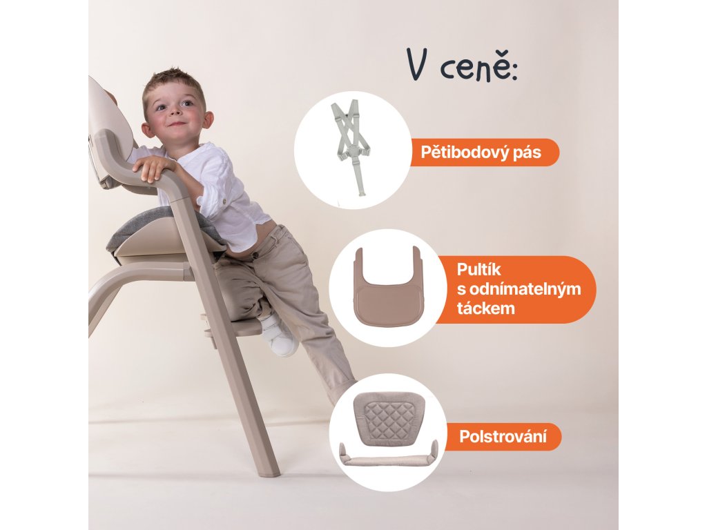 Akonáhle dieťa začne samostatne sedieť, jednoducho odstránite novorodenecký set a získate klasickú vysokú stoličku s praktickým odnímateľným pultíkom. Výškovo nastaviteľné sedadlo aj opierka nôh umožňujú ergonomické sedenie počas celého rastu.