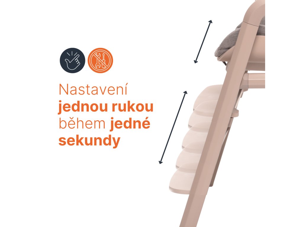 Akonáhle dieťa začne samostatne sedieť, jednoducho odoberiete novorodenecký set a získate vysokú stoličku s praktickým odnímateľným pultíkom. Sedák aj opierku nôh je možné výškovo nastaviť tak, aby sa prispôsobili každej fáze rastu.