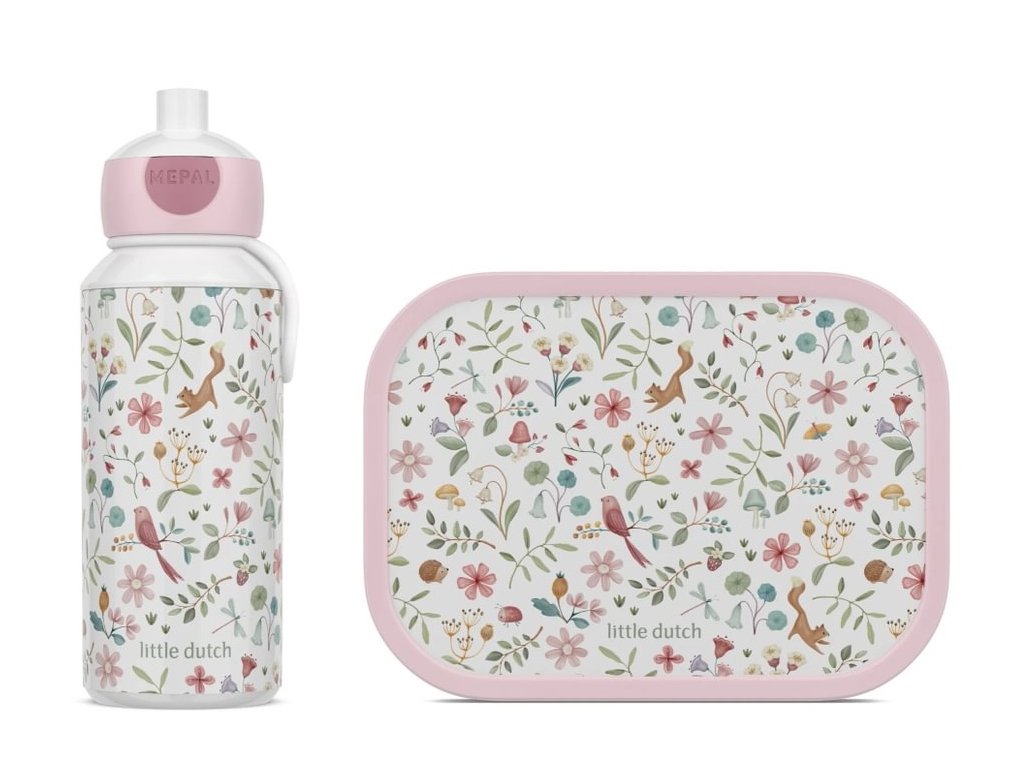 Desiatový set tvorí fľaša s vyskakovacím náustkom a desiatový box s možnosťou rozdelenia na tri priehradky. Stačí stlačiť a môžete piť! Stlačíte znova a fľaša je bezpečne zatvorená! Unikátna fľaša s vyskakovacím náustkom je jednoduchá na používanie a zaručí vám, že obsah fľaše nevytečie, kam nemá. Deti sa ju naučia veľmi rýchlo používať a môže ich tak sprevádzať počas všetkých aktivít, ktoré počas dňa podnikajú. Praktický desiatový box ponúka možnosť rozdelenia na tri priehradky na oddelenie jednotlivých častí uloženej desiaty. Súčasťou boxu je aj malá vidlička, ktorá je ideálna na napichovanie kúskov ovocia či zeleniny. Zacvakávací uzáver je zárukou bezpečného uzavretia obsahu boxu. Sada je súčasťou dizajnovej kolekcie hračiek a doplnkov pre deti Little Dutch Fairy Garden, inšpirovanej životom na záhrade. Materiál: ABS Objem fľaše: 400 ml Rozmery boxu: 17,8 x 13,2 x 6 cm Vhodné do umývačky.Dodatočné parametre