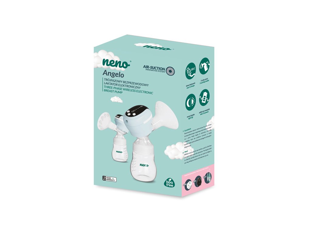 Neno Angelo je bezdrôtová trojfázová odsávačka mlieka. Je podobná ako odsávačka Neno Uno, ale s pridaným tretím režimom odsávania – takzvaným zmiešaným režimomLet-down, ktorý umožňuje efektívnejšie odsávanie materského mlieka. Je ľahká, prenosná a ergonomická - ideálna na výlety a použitie vonku.Fázy dokonale reprodukujú prirodzený rytmus sania dieťaťa. Každá z 3 fáz má 9 úrovní sania, z ktorých si môžete vybrať, čo vám dáva slobodu prispôsobiť si nastavenia podľa individuálnych potrieb. Na konci každého cyklu sa odsávačka mlieka automaticky vypne. Každý cyklus trvá 30 minút.