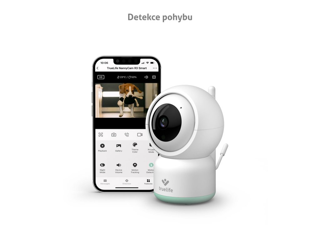 Rotačná pestúnka TrueLife NannyCam R3 Smart dokáže sledovať pohyb a otáčať sa za ním. Navyše jej širokouhlá šošovka vidí do všetkých zákutí a v šere automaticky aktivuje nočné videnie. Dosah pestúnky je vďaka pripojeniu cez internet neobmedzený a vo chvíli, keď máte obrazovku telefónu vypnutú, ona určite nespí. Zaznamená každý pohyb a zvuk a pošle vám oznámenie do vášho telefónu. Záznam navyše môže nahrávať aj v režimu 24/7 na SD kartu.