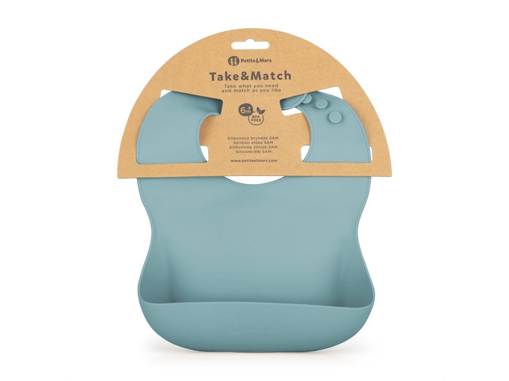 Podbradník je vyrobený z potravinárskeho silikónu bez obsahu BPA. Je určený pre malé deti od 6 mesiacov, ktorým sa zavádzajú prvé príkrmy, a pre tie, ktoré sa už úspešne učia samostatne jesť. Má nastaviteľné zapínanie, ktoré umožňuje prispôsobiť ho veľkosti krku dieťaťa. To znamená, že podbradník rastie spolu s dieťatkom. Vďaka ergonomickému tvaru a mäkkému materiálu sa podbradník pohodlne nosí a neobmedzuje pohyb dieťaťa pri jedení. Dá sa tiež zrolovať, a preto nezaberá veľa miesta v taške, keď idete na prechádzku alebo na výlet.