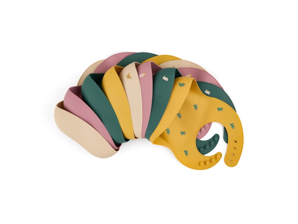 Podbradník je vyrobený z potravinárskeho silikónu bez obsahu BPA. Je určený pre malé deti od 6 mesiacov, ktorým sa zavádzajú prvé príkrmy, a pre tie, ktoré sa už úspešne učia samostatne jesť. Má nastaviteľné zapínanie, ktoré umožňuje prispôsobiť ho veľkosti krku dieťaťa. To znamená, že podbradník rastie spolu s dieťatkom. Vďaka ergonomickému tvaru a mäkkému materiálu sa podbradník pohodlne nosí a neobmedzuje pohyb dieťaťa pri jedení. Dá sa tiež zrolovať, a preto nezaberá veľa miesta v taške, keď idete na prechádzku alebo na výlet.