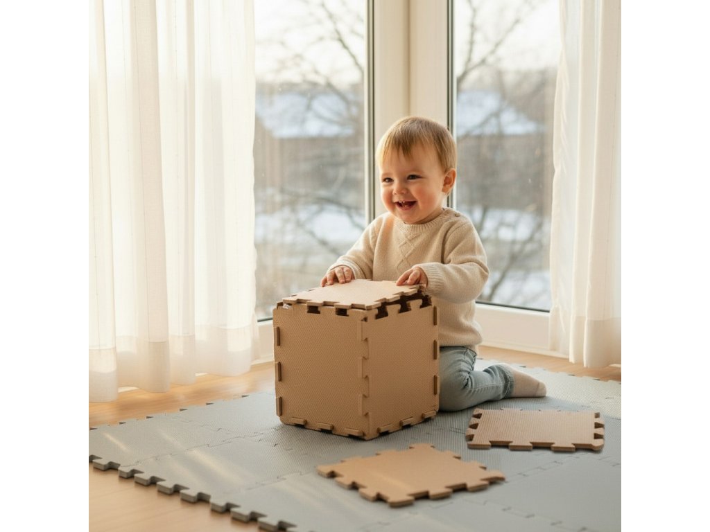 Jednotlivé dlaždice 30 × 30 cm (9 ks) do seba perfektne zapadajú. Podložka je vhodná pre deti od narodenia, vyrobená z nezávadného a príjemného materiálu.