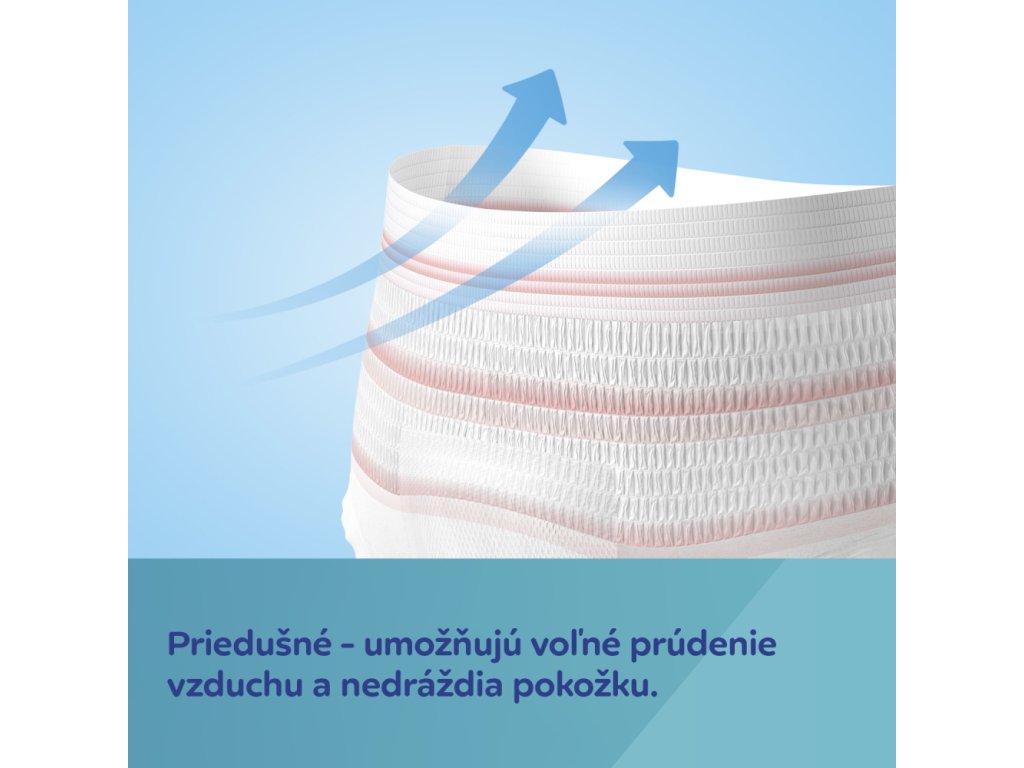 Nohavičky absorbujú až 400 ml tekutiny a poskytujú tak žiaduci pocit sucha. Pokročilá 360 ° ochrana proti úniku zaisťuje plnú ochranu zo všetkých strán, a to aj v ľahu. Priedušný dizajn umožňuje pokožke voľne dýchať, čím sa minimalizuje riziko podráždenia, zatiaľ čo výnimočne mäkká vnútorná vrstva je bezpečná aj pre tú najcitlivejšiu pokožku.