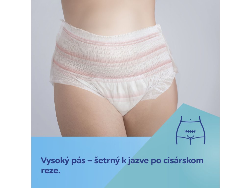 Vysoký elastický pás nohavičiek dokonale padne rôznym typom postáv a zároveň je šetrný k jazve po C-sekcii. Bočné švy nohavičiek je možné pohodlne a jednoducho roztrhnúť, čo uľahčuje zložení. Nohavičky nie sú bielené chlórom a majú hygienické balenie po 1 ks.