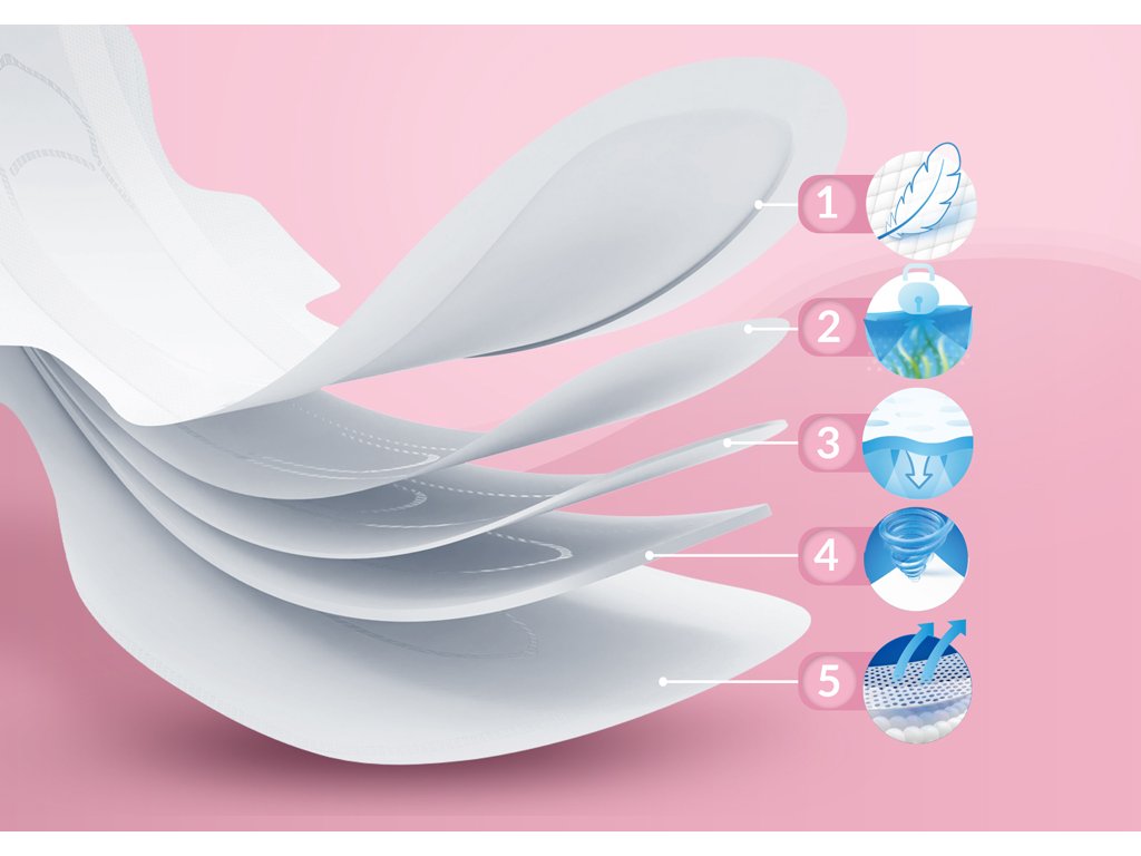 - 4 krídelká: Štyri krídelká sú ďalším bezpečnostným prvkom, ktorý udržiava vložku na mieste bez ohľadu na to, čo robíte. Či už chodíte, ležíte, sedíte, vložka zostáva stabilná a bezpečne na svojom mieste.