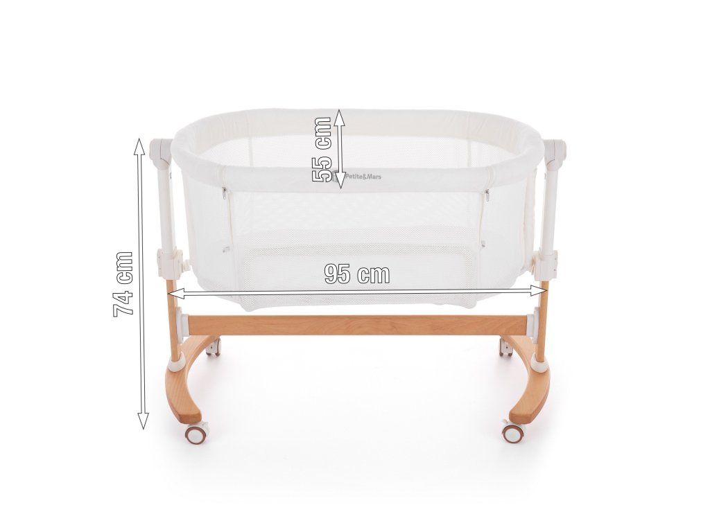 - Výška postieľky je nastaviteľná do 5 polôh, ľahko ju prispôsobíte výške rodičovskej postele (vhodná je pre postele, ktoré majú vrch matraca vo výške 56,5 – 68,5 cm)