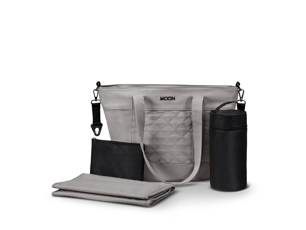 Prebaľovacia taška v dizajne kočíka – praktická a štýlová, s dostatočným úložným priestorom. Obsahuje prebaľovaciu podložku, termo obal na fľašu a kapsičku na drobnosti.