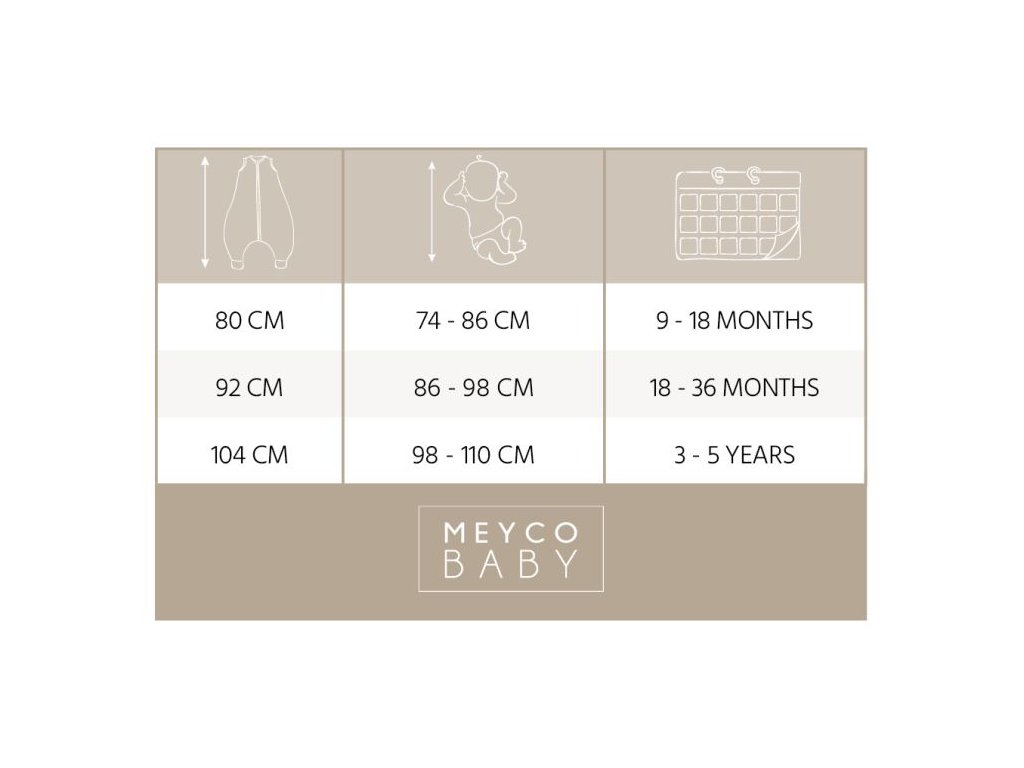Kód: 1852260006 EAN: 4054703592665Je vyroben ze 100% bavlny.Velikost: 104 cm pro použití od 3 do 5 let a délka cca 98 až 110 cmPro určení správné velikosti spacího pytle je důležitá výška vašeho dítěte než věk. Nikdy nepoužívejte spací pytel, pokud hlava vašeho děťátka projde otvorem na krk. Vždy se tedy ujistěte, že používáte spací pytel správné velikosti.Spací vak na spaní má hodnotu TOG 0,5. Čím vyšší je hodnota TOG, tím je teplejší.Lze prát v pračce maximálně na 40 stupňů.Vhodné pro sušení v sušičce při nízkých teplotách. Informace o výrobci MEYCO b-boo baby & lifestyle GmbHTackenweide 5446446 Emmerich am RheinGermany Phone number: +49 (0)2822 976500 https://www.meycobaby.com/E-mail: info@meycobaby.com Bezpečnostní upozorněníVýrobek není hračka. Nevystavujte blízkosti ohně. Plastový obal držte mimo dosah dítěte, hrozí nebezpečí udušení.Dodatočné parametre
