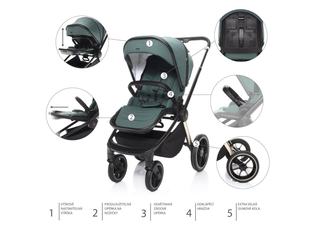 Predĺžiteľná a výškovo nastaviteľná strieška spoľahlivo chráni dieťa pred ostrým slnkom, vetrom aj slabým dažďom. Je vybavená vetracím okienkom pre príjemné prúdenie vzduchu.